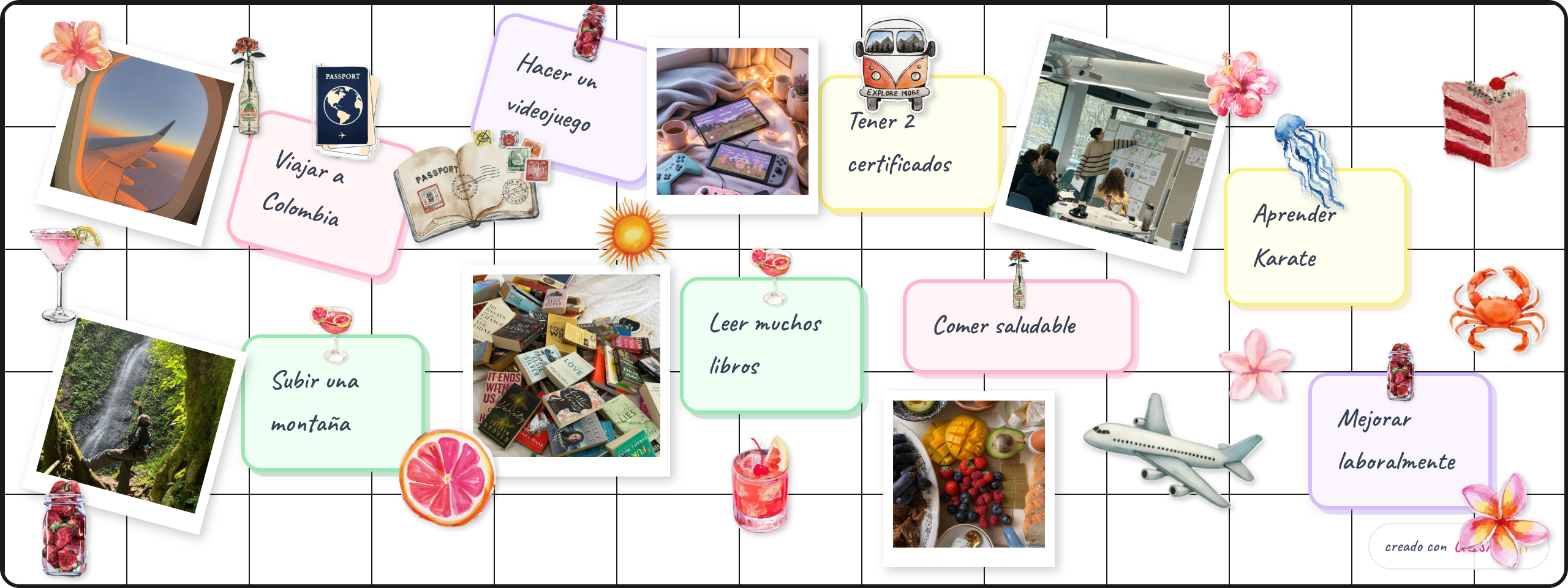 Crea tu tablero de vision con nuestro editor drag & drop. Agrega imagenes, texto, stickers y mas para visualizar tus metas.